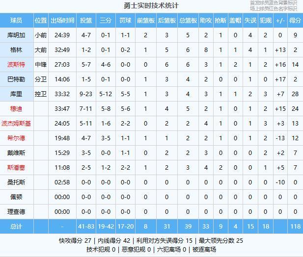 勇士数据(主队):库里28分4板3助、穆迪24分5板2助、波斯特14分6板3助2帽、波杰姆斯基13分2板4助、希尔德12分2板2助、库明加9分5板2助、斯潘塞7分3板4助2断、戴维斯7分2板3助、格林2分6板8助、巴特勒2分4板2助