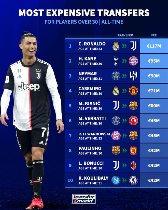 北京时间10月29日,德转统计出了30岁以上的球员转会费榜,其中C罗以1.17亿欧元居首,凯恩内马尔分列二三。